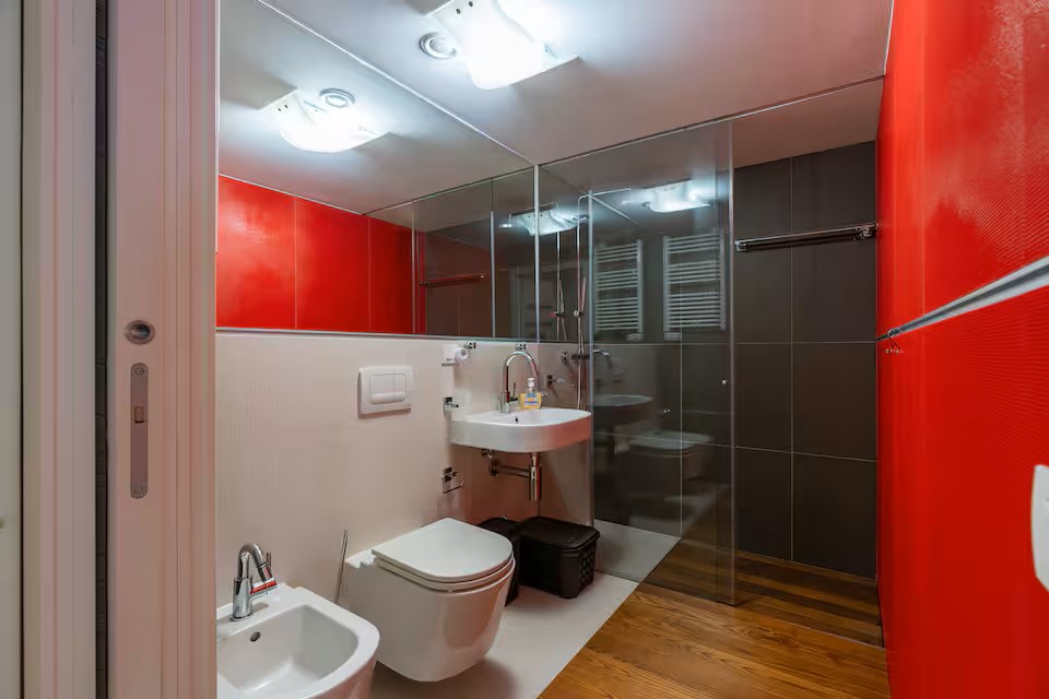 Das Bad ist modern, geräumig und funktional, mit Dusche und WC.