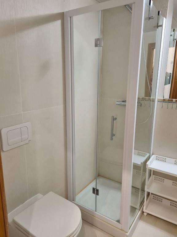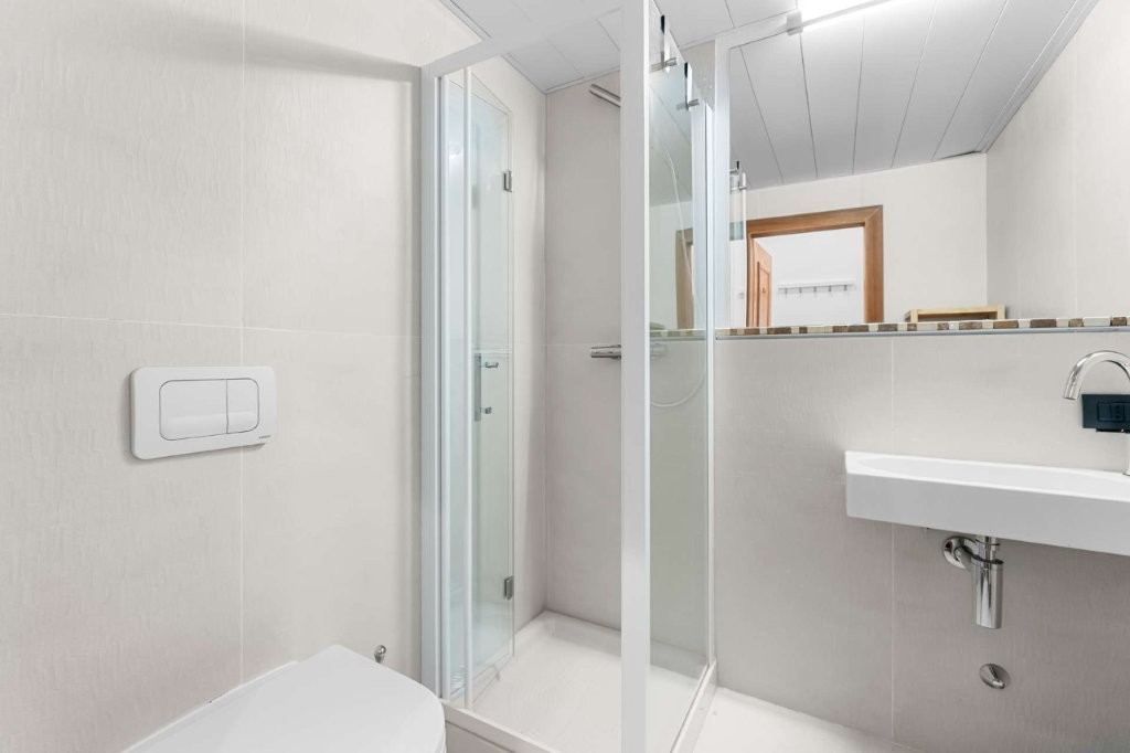 Das Bad ist modern, und funktional, mit Dusche und WC.